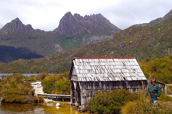 | Cheryl on the shores of the lake with Cradle Mountain thebackground